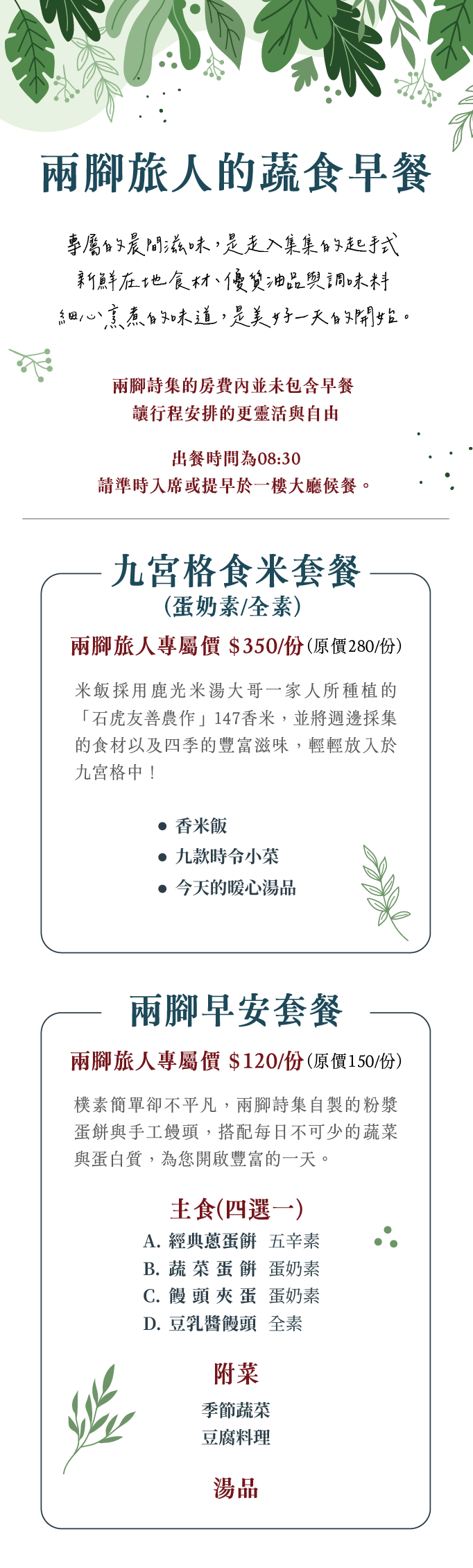 用餐須知 可於官網訂房或入住前三天填寫線上Check in表單時加購 為確保廚房作業順暢以及您能即時品嚐到食材的最佳狀態,請留意以下事項 出餐時間為 08:30,請準時入席,歡迎提早下來等候。 如超過用餐時間15分鐘未入席,為維持品質將取消餐點,恕不退費。 若有忌口食材,請務必於訂餐時來訊告知,避免食材浪費。 餐點請於用餐區享用,恕無提供外帶或帶回房內用餐。